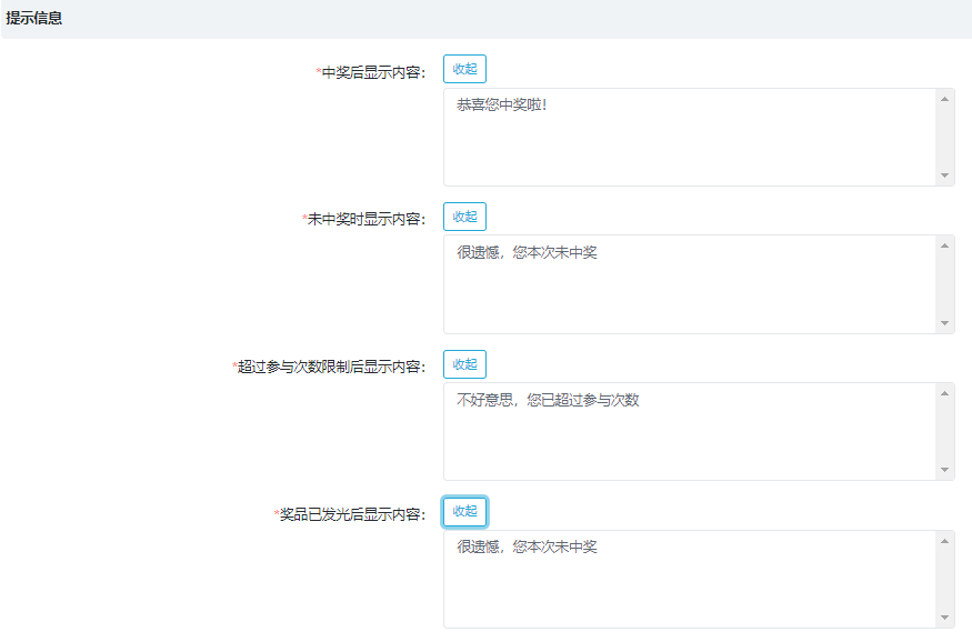 抽奖活动也是我们用得比较多的活动之一,我们在配置抽奖活动中需要配置中奖页面提示语,以前需要大家自己去写,现在我们给大家写好了,增加了回复语默认值,无需再一个个填写。当然,如果你想换更有意思的回复语,直接编辑就可以更改啦~