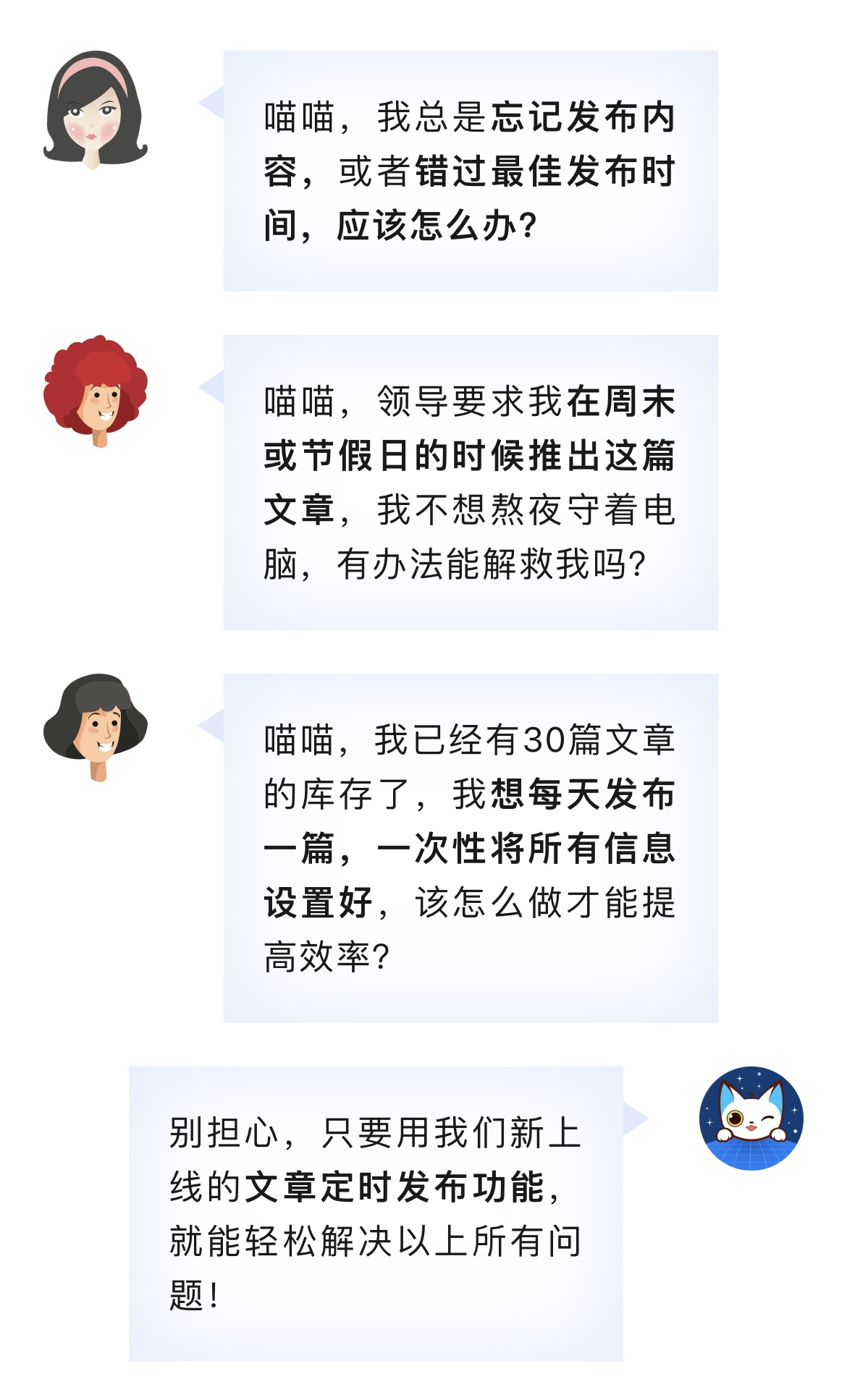 利用文章定时发布功能,我们可以保证发布的规律性和延续性,进而掌握用户的阅读习惯和需求,有选择性地更新内容,提高内容质量。为用户定期提供优质内容,这有助于与用户建立深远长久的联系,提高用户对我们的使用率和信任度。